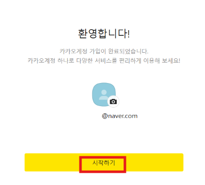 다음 비밀번호를 입력해 주고 넘어갑니다. 닉네임은 변경이 가능하니까 걱정 말고 아무거나 써도 됩니다. 여기까지 따라왔다면 이제 새로운 카카오계정이 만들어진 거예요. 시작하기 버튼을 누르고 다음으로 넘어가 볼게요.