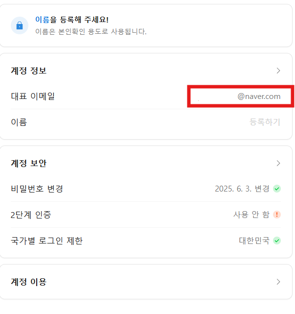 아이디 생성이 완성되면 서비스로 돌아가기를 누릅니다. 이제 프로필에서 닉네임 부분을 선택해 대표 이메일을 설정해 주겠습니다.