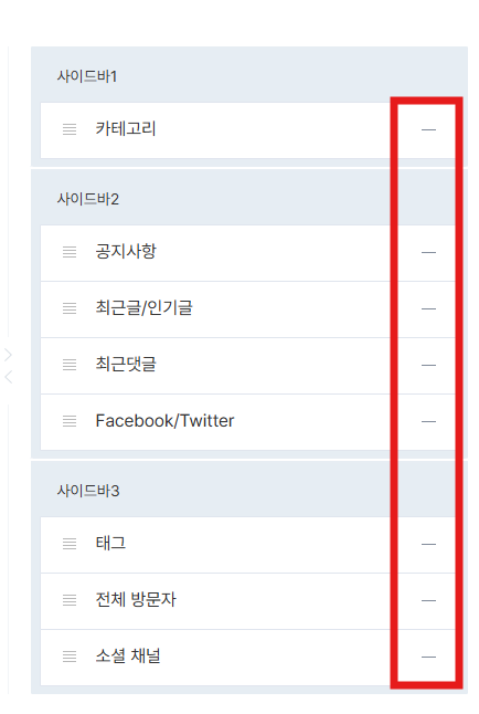 꾸미기> 사이드바로 가셔서 사이드바를 모두 삭제해 주세요.