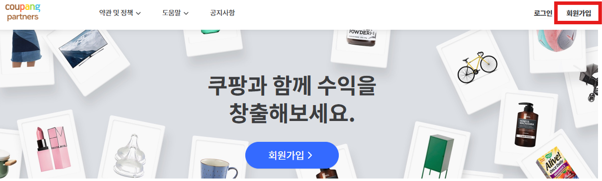 먼저 구글, 네이버, 다음 상관없이 쿠팡파트너스를 검색하고 공식 사이트로 이동해줍니다. 사이트의 가장 우측 상단에 회원가입버튼을 클릭합니다.
