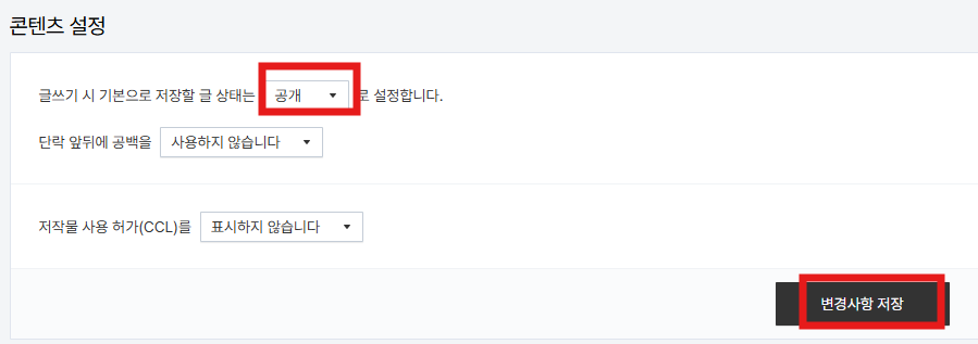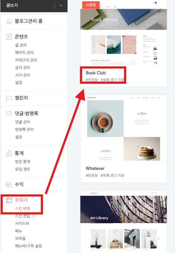 콘텐츠> 설정에서 비공개 부분을 공개로 변경해 줍니다. 꾸미기> 스킨변경> 북클럽 적용