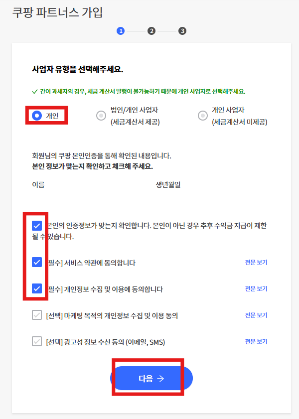 기존 사용중이 쿠팡아이디로 로그인을 진행합니다. 회원가입을 계속 진행하시면 사업자 유형은 개인 그리고 아래 필요한 것들만 체크해서 진행해 주었습니다.