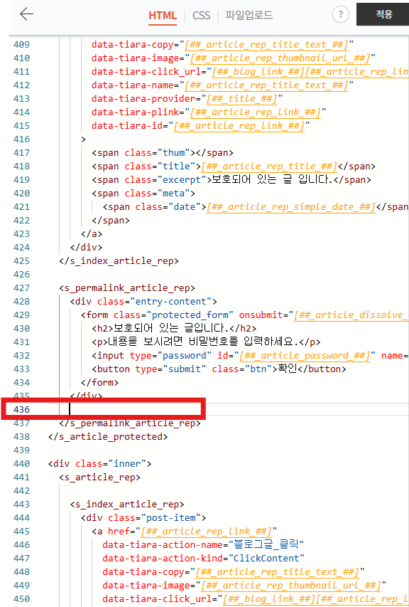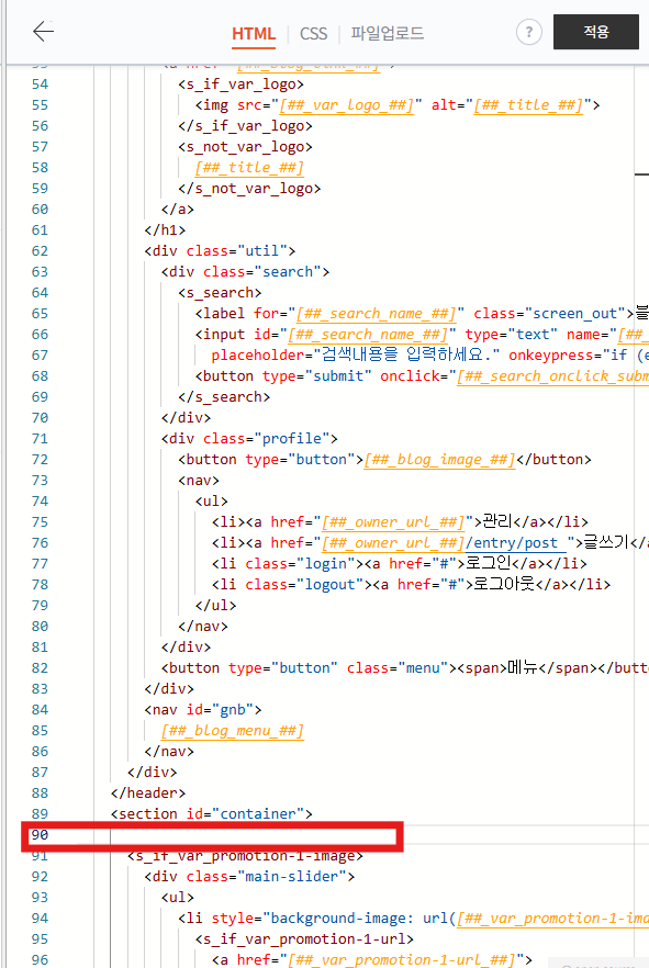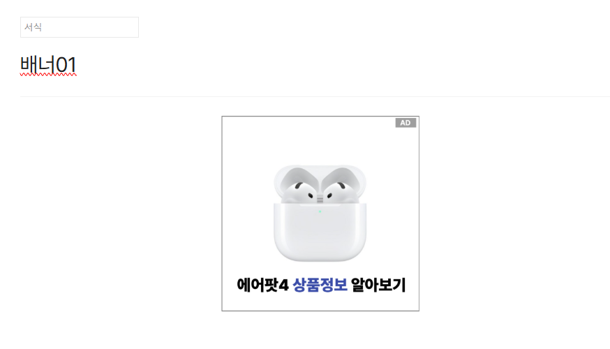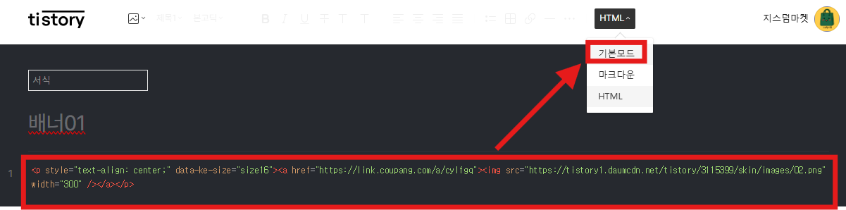 배너 코드를 붙여 넣고, 다시 기본모드로 돌아갑니다.