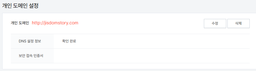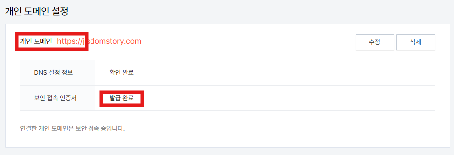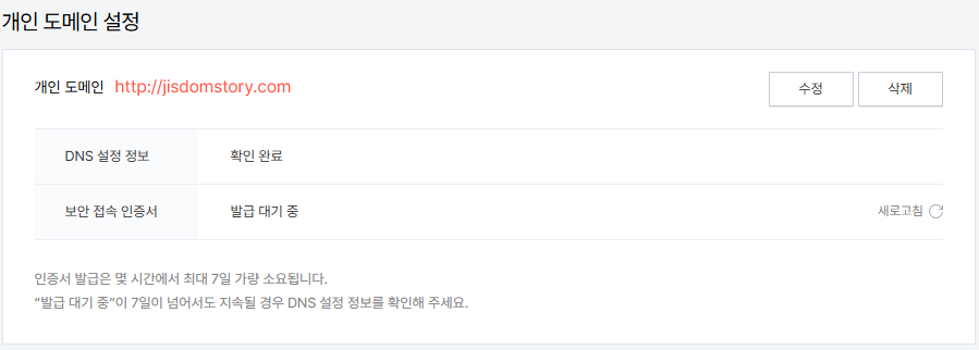 아직 보안 접속 인증서에는 아무것도 없지만 시간이 지나면 발급대기 중에서 발급완료로 바뀌고, 개인 도메인 주소가 http에서 https로 바뀌어야 완료됩니다.