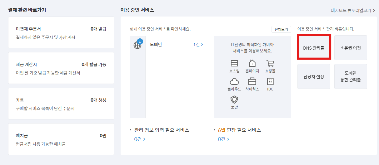 이용중인 서비스 우측에 DNS관리툴이라는 글자를 선택해 줍니다.