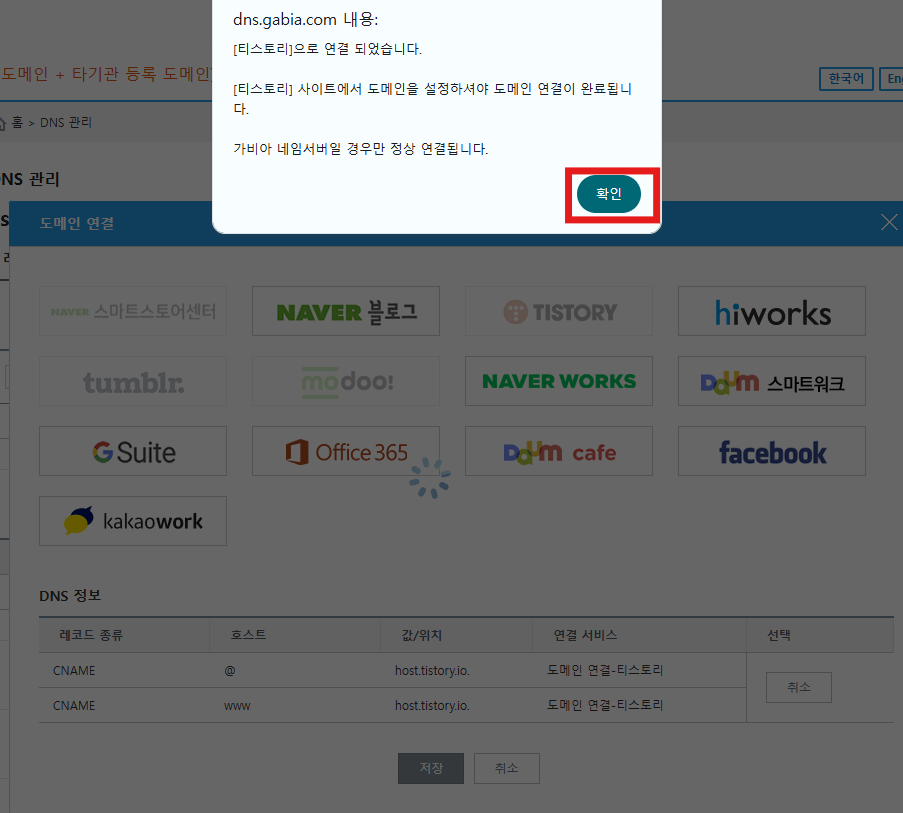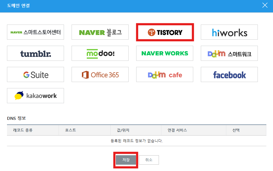 저희는 티스토리에 연결할거니까 TISTORY 선택해 저장버튼을 눌러주세요.