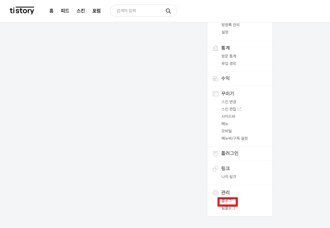 티스토리 블로그 설정에서 가장 하단에 관리>블로그를 선택합니다.